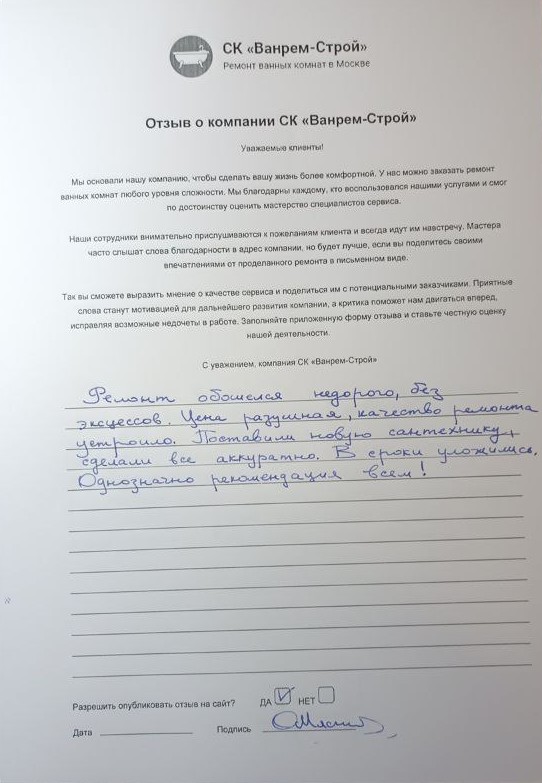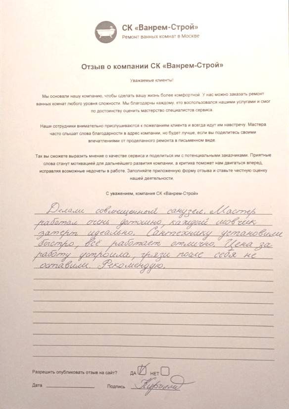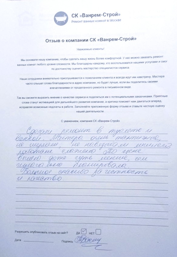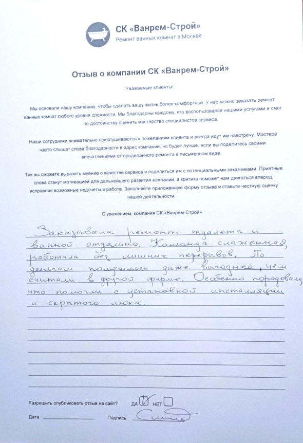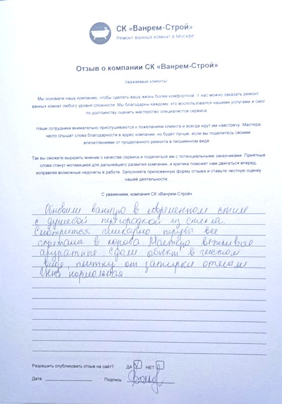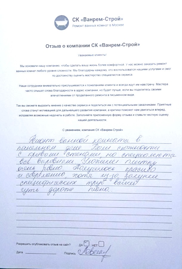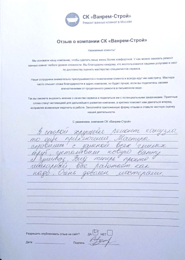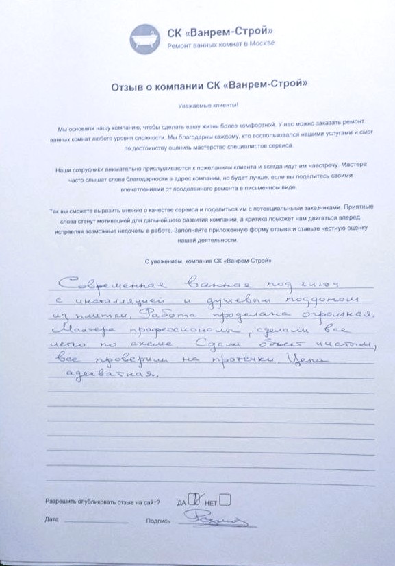 Реальные заказчики дают объективную оценку комплексной работы коллектива сотрудников СК «Ванрем-Строй». Для получения достоверной информации о качестве предоставляемых нами услуг по ремонту ванных комнат, санузлов и туалетов, изучите отзывы клиентов нашей компании.