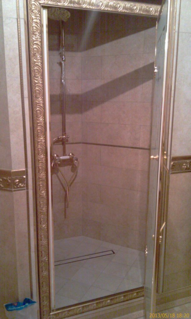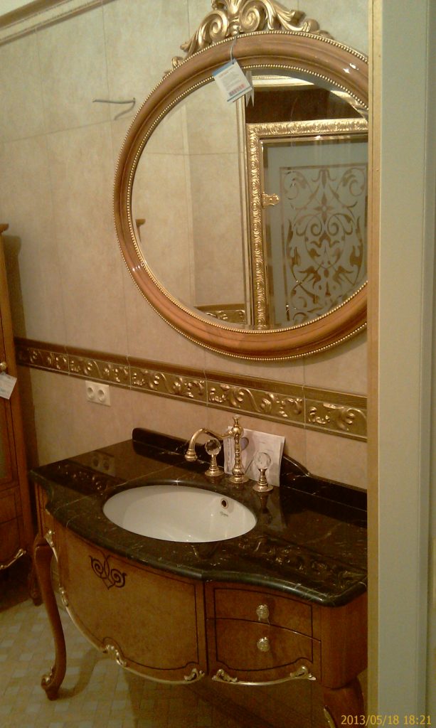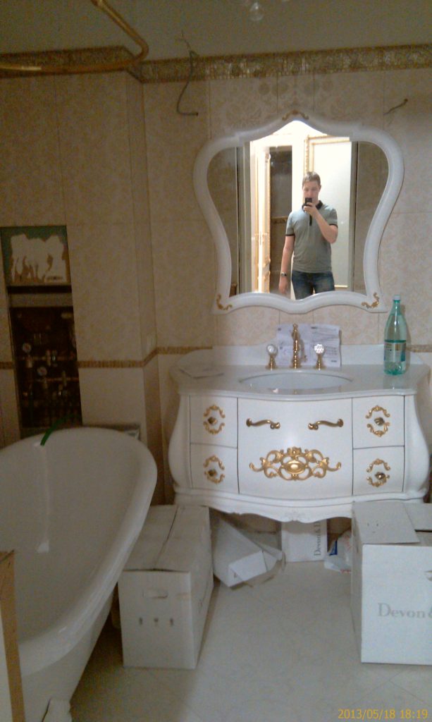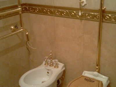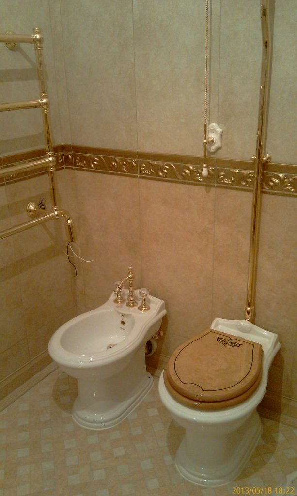 Оба раздельных санузла в квартире в новостройке на Цветном бульваре оформлены в классическом дворцовом стиле. Для поддержания аристократического интерьера мы выбрали круглую ванну на изогнутых ножках, роскошные умывальники с фигурными шкафами и просторный душевой уголок с раздвижной дверкой. Полотенцесушитель и трубы окрашены в благородный бронзовый цвет в тон золотой фурнитуре. В одном санузле установлены напольные унитаз и биде, душевая кабина и рукомойник с тумбой, над которым навешано круглое зеркало в массивной раме. Во втором помещении смонтирована ванна и собран мойдодыр. Отделка стен керамической плиткой двух тонов выполнена по индивидуальному дизайн-проекту. Цена ремонта – 121000 рублей. Стоимость черновых материалов – 28000 руб.