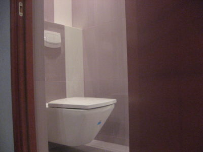 При ремонте раздельного санузла на улице Вавилова мастера полностью демонтировали отделку вплоть до бетона и разобрали старый трубопровод. После укладки стяжки, выравнивания поверхностей и монтажа коммуникаций мы установили на потолок подвесную конструкцию со встроенными светильниками, а пол и стены облицевали крупноформатной керамической плиткой в трендовом бежевом цвете. Прямоугольная ванна занимает всю нишу вдоль глухой стены. Изюминки интерьера: облицованный в тон общей композиции экран, отсутствие привычного умывальника и монтаж крана прямо на торцевой части ванны. В помещении также установлены подвесной унитаз с душем биде и электрический полотенцесушитель. Цена ремонт – 124 тыс. руб. Черновые материалы – 33000 р.