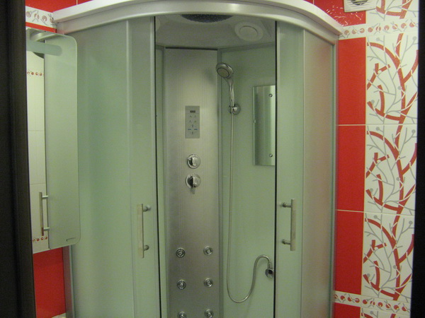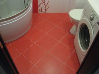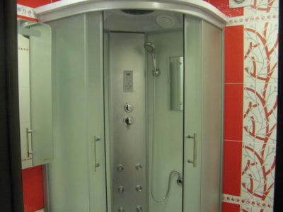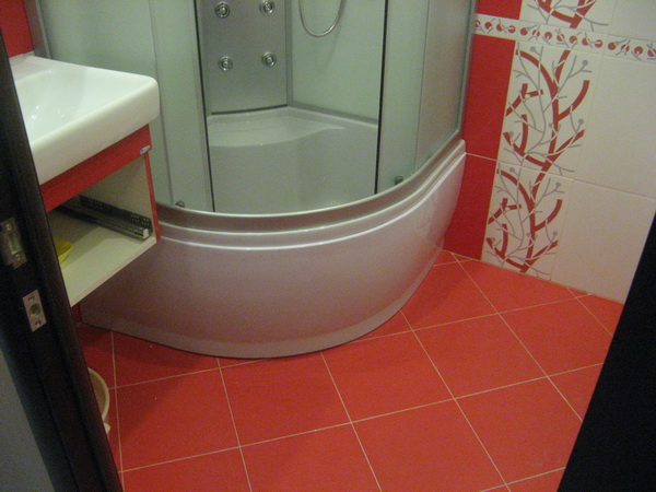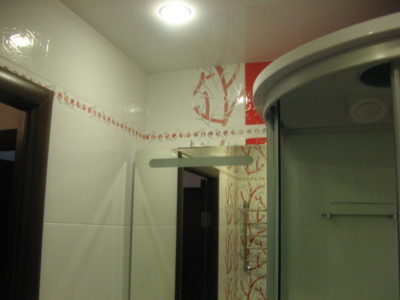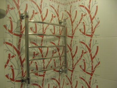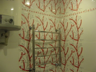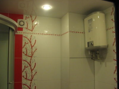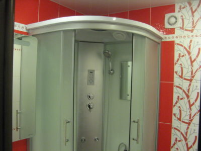 Наша компания выполнила ремонт санузла на улице Юных Ленинцев. Для отделки стен мы выбрали чисто белую керамическую плитку и украшенную ярким фактурным рисунком. На пол уложен кафель насыщенного красного цвета по диагонали. В помещении установлены душевая кабина, унитаз и стиральная машина, смонтированы водонагревательный прибор и подвесной умывальник. В натяжной потолок встроены точечные светильники, а отверстие вентиляционной шахты мы защитили решеткой с принудительной вентиляцией. Смета на ремонт — 112 тыс. руб. Расходы на черновые материалы — 32 тыс. руб.