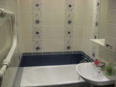 Капитальный ремонт совмещенной ванной и туалета на улице 2 Рощинская занял 22 дня. Мастера полностью демонтировали коммуникации, сняли старую отделку со стен и напольное покрытие. На пол была уложена новая стяжка и синяя плитка, стены облицованы кафелем белого и темно-синего цвета, а потолок декорирован подвесной реечной конструкцией. Для придания комнате нарядного вида над ванной выложен вертикальный узор с цветочным принтом и золотым тиснением. С правой стороны от входа установлены унитаз и подвесной умывальник, над которым мы смонтировали зеркало с боковым шкафом и дополнительными светильниками. Цена ремонта – 98000 рублей. На черновые материалы ушло 31 тыс. руб.