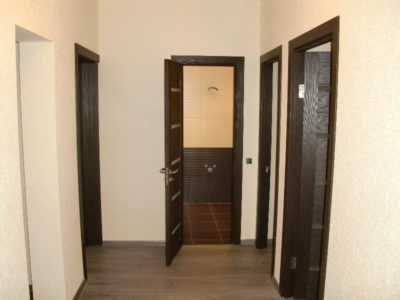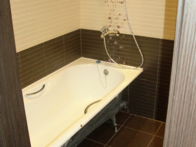 На капитальный ремонт совмещенного санузла на улице Гарибальди у нас ушло 32 дня. Для капитального обновления интерьера мы уложили стяжку и сделали гидроизоляцию пола, проложили новые коммуникации и усиленную электропроводку. Для отделки поверхностей дизайнер выбрал крупноформатную плитку с рифленой структурой и горизонтальными полосами в двух трендовых цветах: кремовый и шоколадный. На пол уложен кафель светло коричневого цвета. На потолке установлена подвесная реечная конструкция, в которую встроены круглые точечные светильники. Из сантехники в помещении установлена полукруглая ванна на стальных ножках и напольный унитаз. Нарядности интерьеру придает выложенный вдоль двух стен около сантехники винтажный рисунок с легким цветочным принтом. Цена ремонт – 88 тысяч рублей. Черновые материалы – 26 тыс. руб.