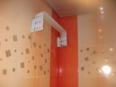 При выполнении ремонта санузла на Варшавском шоссе были использованы яркие отделочные материалы сочного оранжевого и нежного кремового цветов. Эксклюзивности интерьеру придает декоративный орнамент по верхней верхней части стены. Потолок оформлен пластиковыми панелями с вмонтированными точечными светильниками. Нетрадиционным решением стала установка складного полотенцесушителя. Акриловая ванна зашита экраном с дверцами, смонтирован умывальник с тумбой, укомплектованной стеклянными фасадами, а также установлен унитаз стандартной модели. Стоимость ремонта — 124000 руб. Цена черновых материалов — 30890 р.