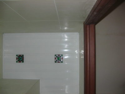 Наша компания выполнила ремонт туалета на улице Юных ленинцев. Мы отошли от принципов классического оформления стен в два цвета и облицевали боковые поверхности белоснежным кафелем. На пол уложена зеленая плитка с фактурным рисунком. С ее помощью также выделена туалетная зона. Защитный экран для коммуникаций замаскирован под общий интерьер. Потолок оформлен пластиковыми панелями со встроенными светильниками. Смета на ремонт — 28 тысяч рублей. Стоимость черновых материалов — 7600 р.