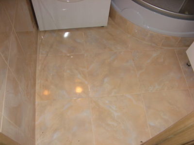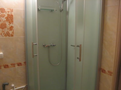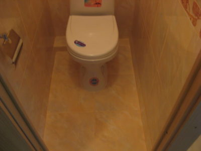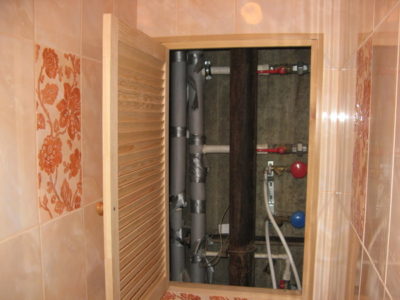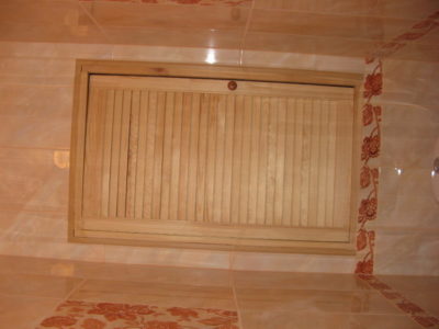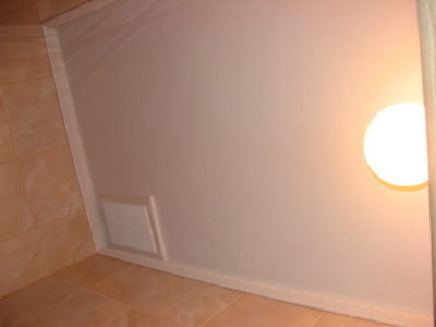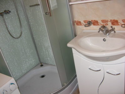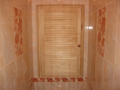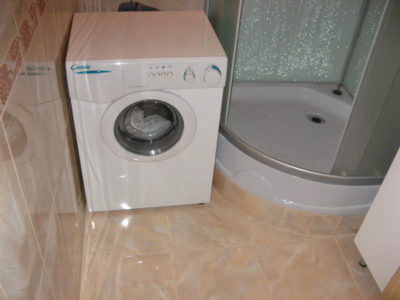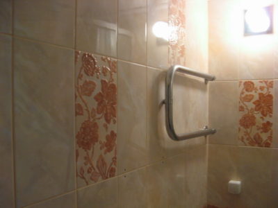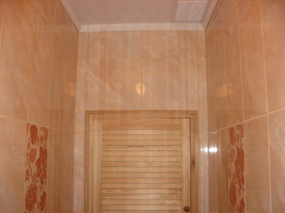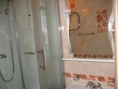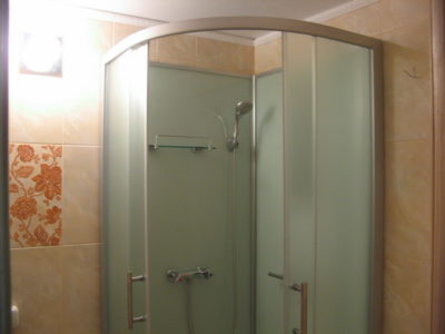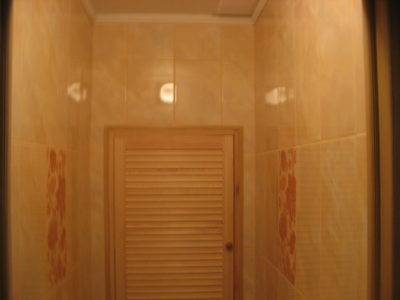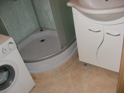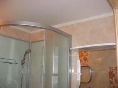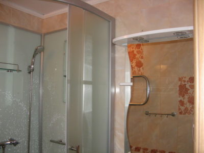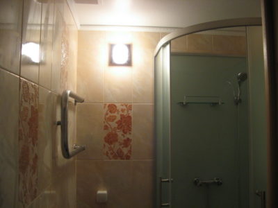 В ванной установлены душевая кабинка, стиральная машина, мойдодыр и полотенцесушитель. В туалете смонтирована гребенка отопления. Распределительный коллектор скрыт за дверцей. Выровненный потолок окрашен в белый цвет влагоустойчивой краской. Для освещения помещений используются классические бра.