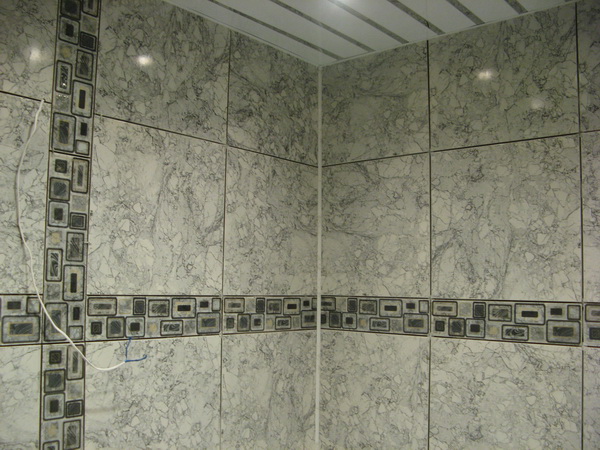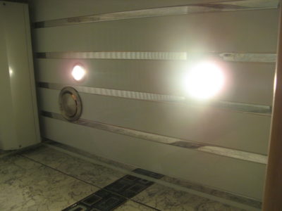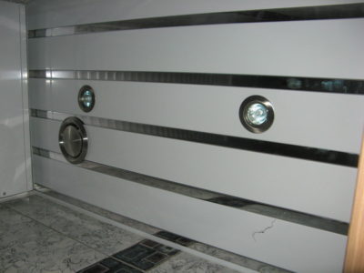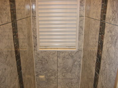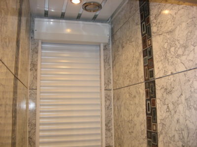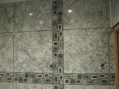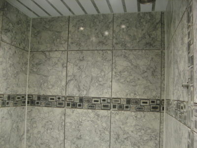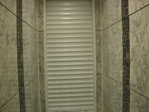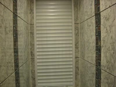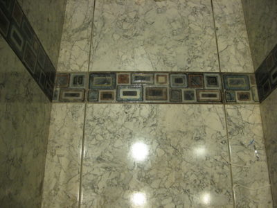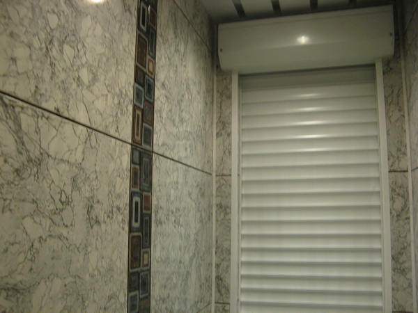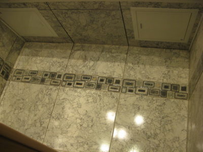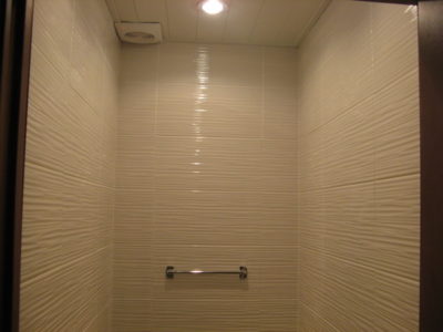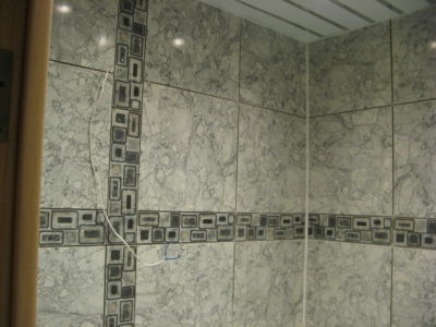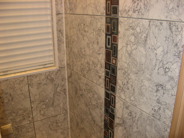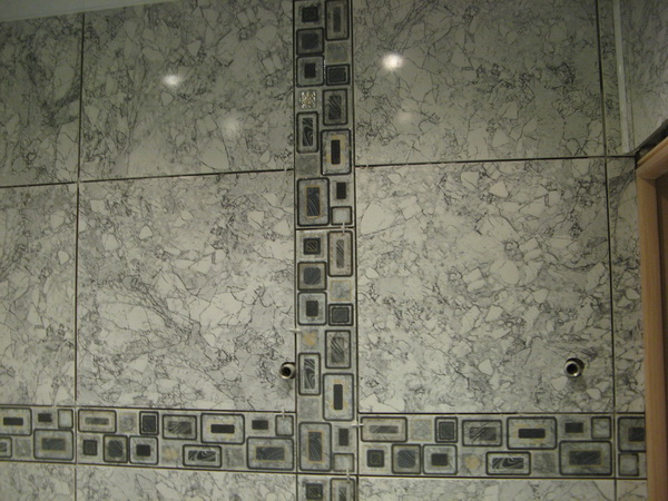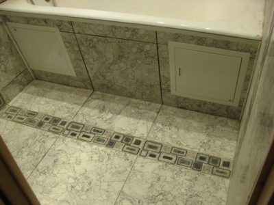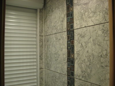 При выполнении ремонта ванной комнаты и 2 туалетов на улице Новосущевская основной упор сделан на оформление поверхностей. Для отделки стен и пола была выбрана керамическая плитка с рисунком, имитирующем мрамор и натуральный камень. Из кафеля и фризы различных оттенков выложены панно, визуально расширяющие пространство в обоих помещениях и придающие им дополнительный объем. Подвесной потолок сделан из пластиковых панелей, чередующихся с зеркальной полосой. В него вмонтированы точечные светильники. Установленная в туалете гребенка отопления скрыта за защитным экраном с вертикальными жалюзи. Цена ремонта — 126000 рублей. Черновые материалы — 35 тыс. руб.