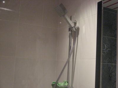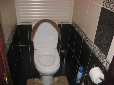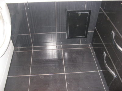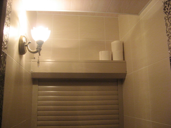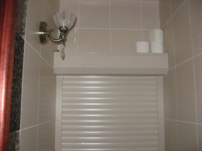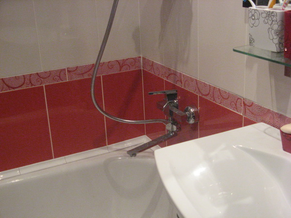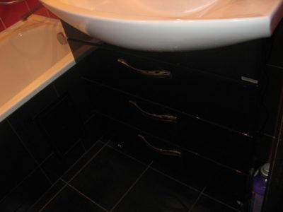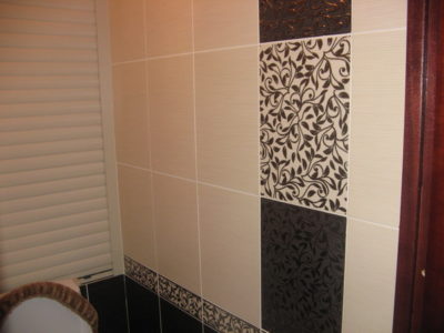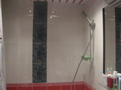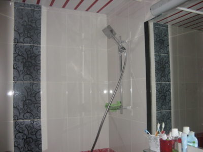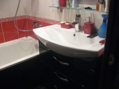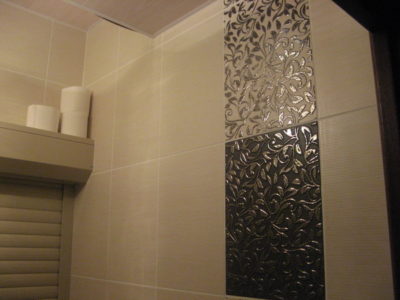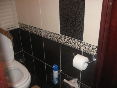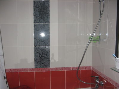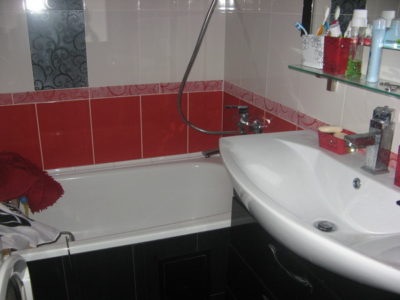 Ремонт ванной комнаты и туалета в Мытищах выполнен в белых, черных и красных тонах. Для декорирования мы использовали серую керамическую плитку с позолоченным узором. Усилить общее впечатление от дизайна удалось за счет установки шкафа под рукомойник и декорирования экрана под ванну темных оттенков. В туалете смонтировано боковое бра, а инженерные коммуникации скрыты за вертикальными жалюзи. В ванной комнате разместили необходимое сантехническое оборудование и стиральную машину. Потолок оформлен в красно-белом цвете пластиковыми панелями. Для освещения выбраны встроенные точечные светильники. Бюджет ремонта составил 118 тысяч рублей. Черновые материалы — 30 тыс. руб.