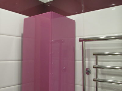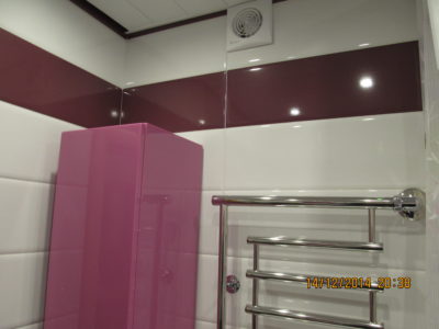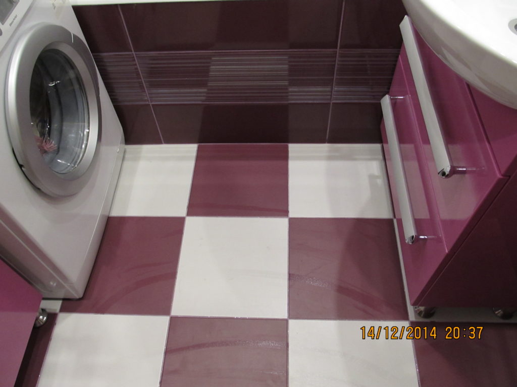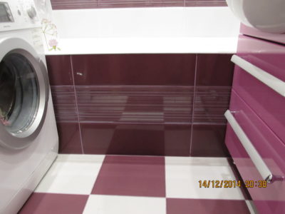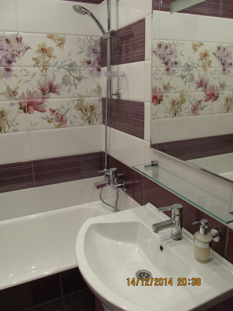 Для воплощения дизайнерской идеи при ремонте ванной комнаты на улице Чертановская была закуплена керамическая плитка с глянцевой поверхностью двух контрастных цветов. Смелое сочетание белого и бордо позволило создать в помещении камерную обстановку, а декоративное панно из кафеля с цветочным принтом придало композиции дополнительного шарма. Мы установили реечный потолок и вмонтировали в подвесную конструкцию точечные светильники. Для создания целостного ансамбля по краям потолка смонтирована темно-коричневая лента, а для обработки швов использовалась двухкомпонентная затирка с блестками. Из сантехники установлены ванна, умывальник с тумбой и полотенцесушитель. Также мы подключили стиральную машину, смонтировали шкаф для хранения кухонных принадлежностей и закрепили на стене держатель для душа. Цена ремонте – 73500 тысяч рублей. Стоимость расходных материалов – 20 тыс. руб.